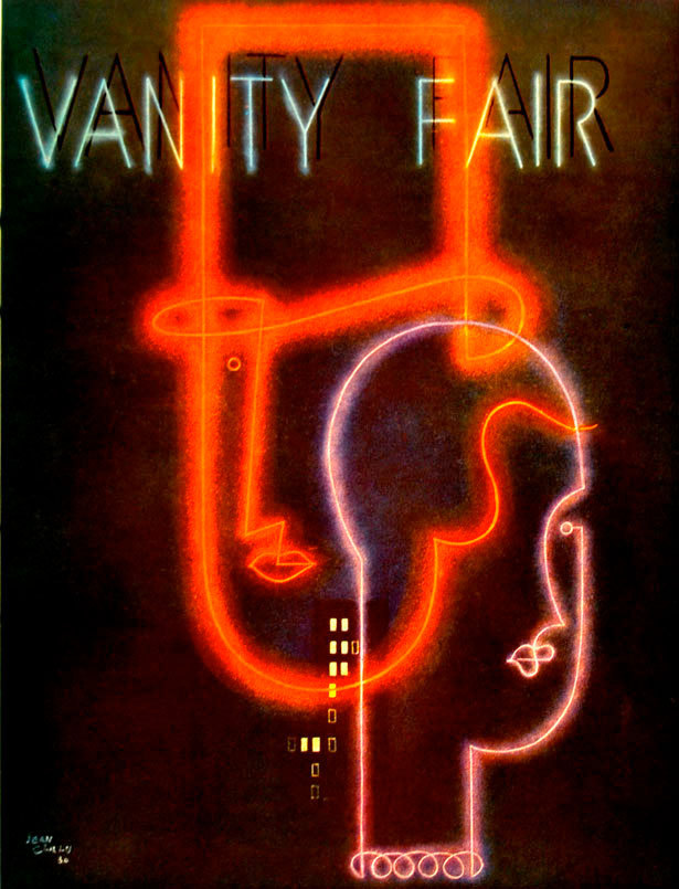 In 1931, Jean Carlu, a French graphic designer, created the April cover. Carlu is known for his cubist inspired art, particularly patriotic posters. What drew me to this piece was the high level of sophistication in the design. The 1929 font heavy ‘Vanity Fair’ is replaced with a skinny neon effect font with drop shadow. This gives the illusion that the text is glowing in the dark. The image appears to be a man and woman face overlapping, with simplistic features that give it a contemporary twist. Compared to Agha’s 1929 design this style is a lot more dramatic and intense, like a New York street night.